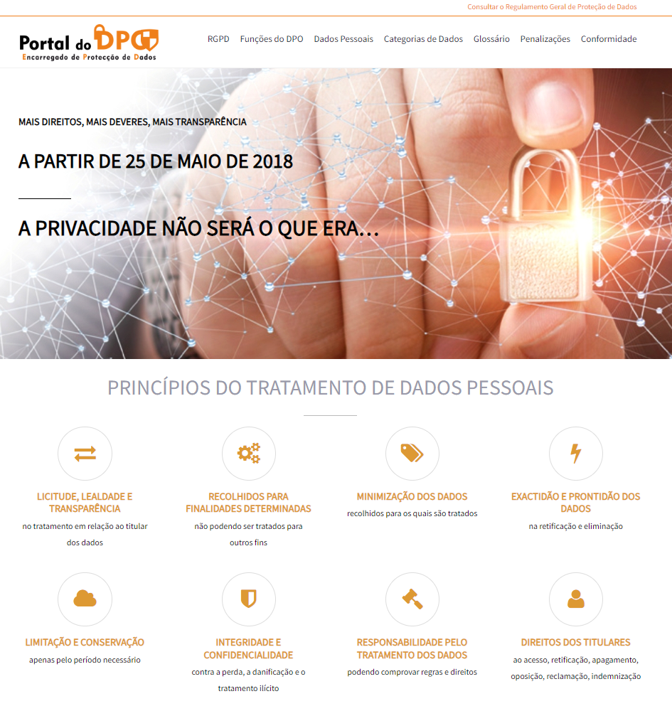 Este portal foca-se nas necessidades e especificidades do Regulamento Geral sobre a Proteção de Dados (RGPD). Foi concebido como um guia digital de consulta rápida e prática, que visa sistematizar a implementação de um sistema de proteção de dados nos seus âmbitos legal, tecnológico, processual e organizacional.